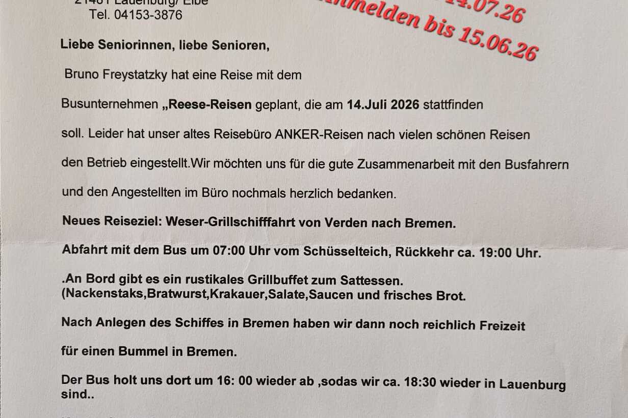 Bitte meldet euch verbindlich bis spätestens 15.06.2026 fernmündlich bei Bruno Freystatzky unter 04153-3876 an.